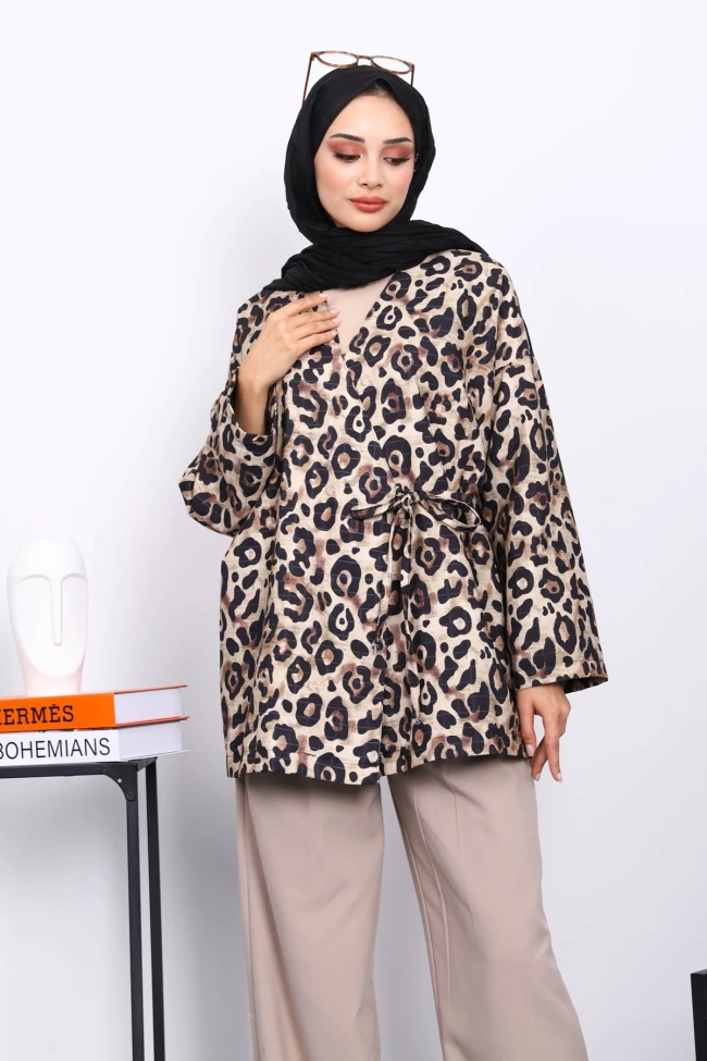 İndigo Etnik Desenli Yan Bağlamalı Kimono Ceket Bej Etnik Desenli Yan Bağlamalı Kimono Ceket