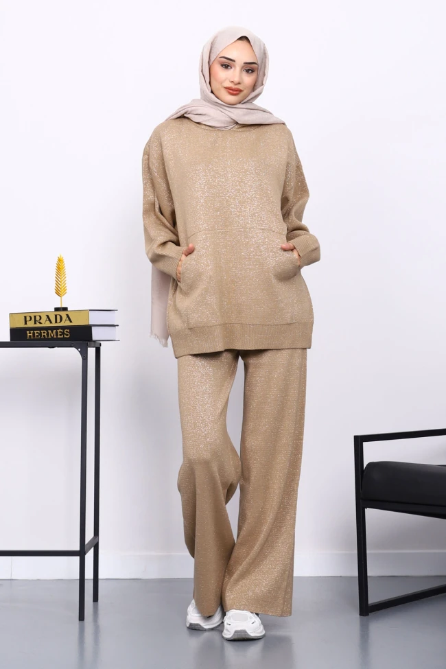 Siyah Kapşonlu Kanguru Cepli Pantolonlu Triko Takım Yağ Yeşili Kapşonlu Kanguru Cepli Pantolonlu Triko Takım Ekru Kapşonlu Kanguru Cepli Pantolonlu Triko Takım