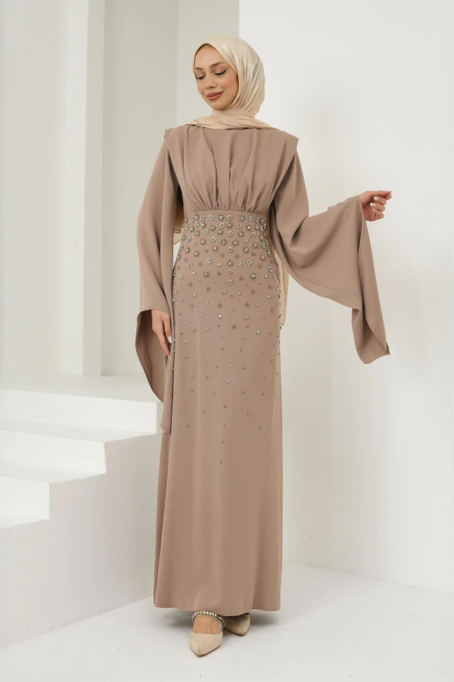 * Ürün Detay :Zarafeti ve modest çizgi çok başarılı bir şekilde harmanlamıştır. Elbisenin en dikkat çekici kısmını oluşturan geniş ve dökümlü kollar, tasarıma hem dramatik bir hava katıyor hem de hareket özgürlüğü sağlıyor. Bu kesim, omuz hattını daha zarif gösterirken elbiseye modern bir silüet kazandırmış.Bel bölgesindeki yoğun taş ve boncuk işlemeleri, dikkati vücudun en ince noktasına çekerek proporsiyonu dengeliyor.