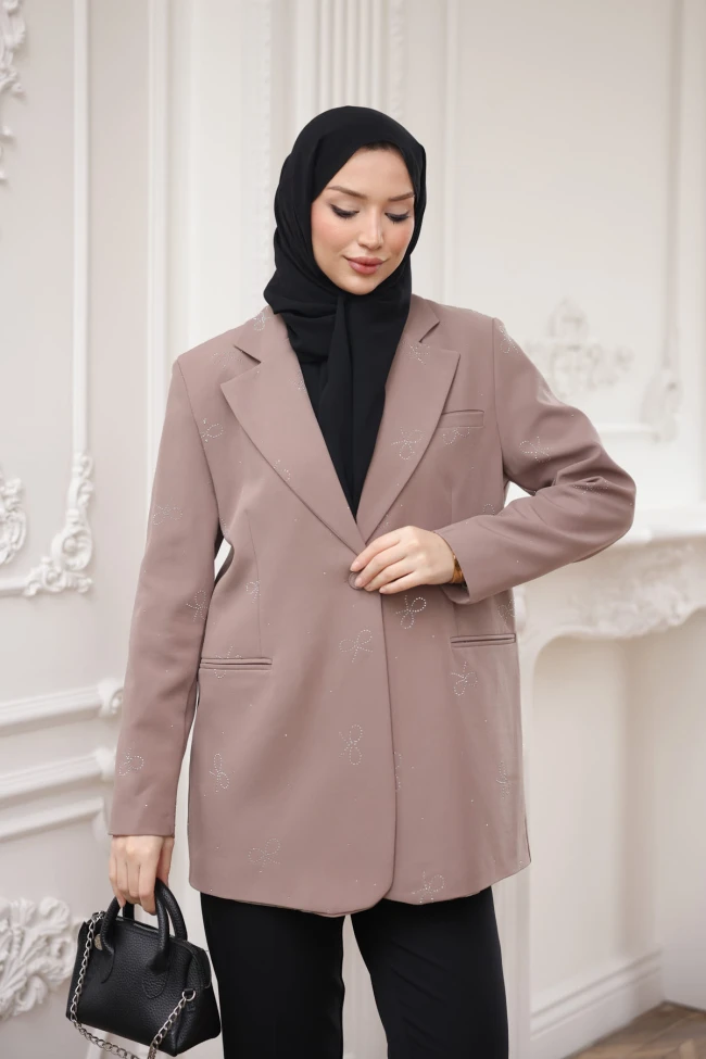 * Ürün Detay : Fiyonk taş işlemeleriyle parlayan, zarif bir tasarım.ceket, klasik blazer formunu ışıltılı ve romantik detaylarla birleştiren, oldukça zarif bir parça.Ceket, modern bir oversize (geniş kesim) kalıba sahip. Boyunun uzunluğu, özellikle tesettür giyimde aranan o ölçülü ve şık duruşu sağlıyor.Ceketin her yerine serpiştirilmiş küçük fiyonk şeklindeki taş işlemeler, tasarıma romantik ve feminen bir hava katmış. Bu detay, ceketi günlük bir parçadan çıkarıp özel davetlerde de giyilebilecek bir "star parça" haline getiriyor.Astarlıdır.