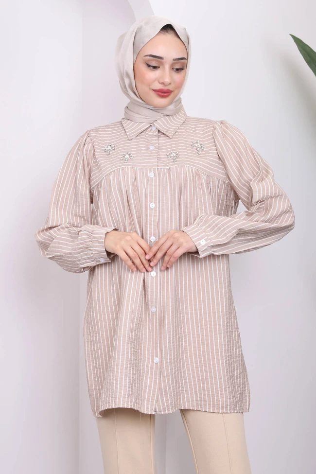 * Ürün Detay : Yeni Sezona Uygun Terikoton Kumaştan üretilmiştir. Boydan düğmelidir. Çizgilidir. Yaka taş detaylıdır.