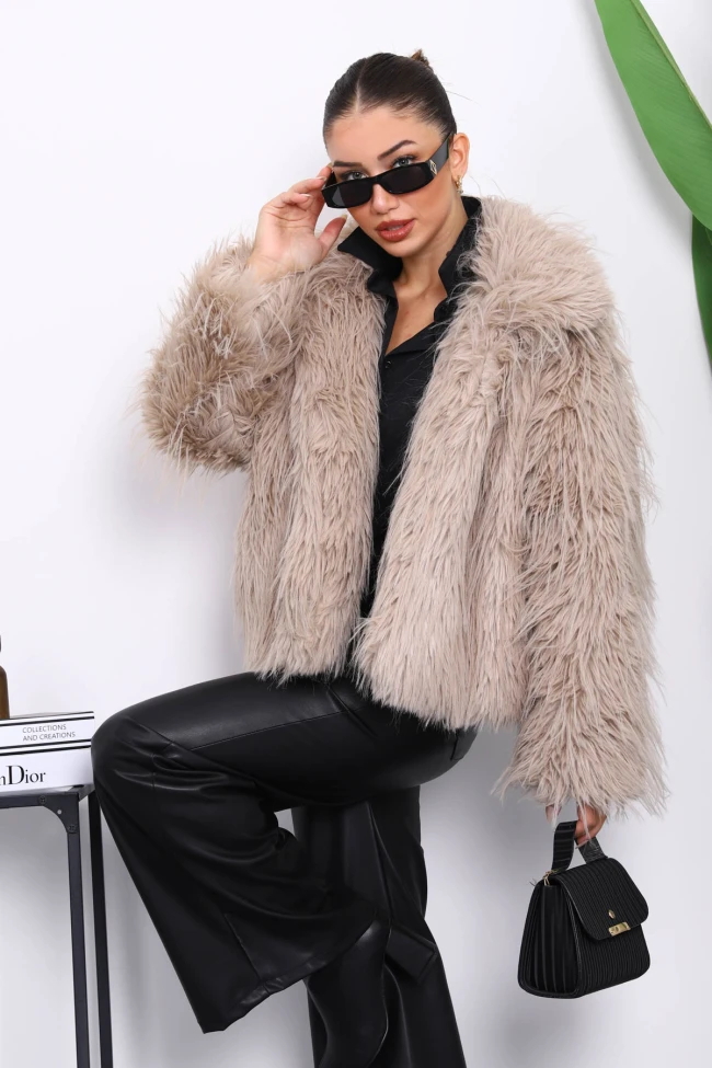 Koyu Bej Yakalı Kürk Ceket Ekru Yakalı Kürk Ceket