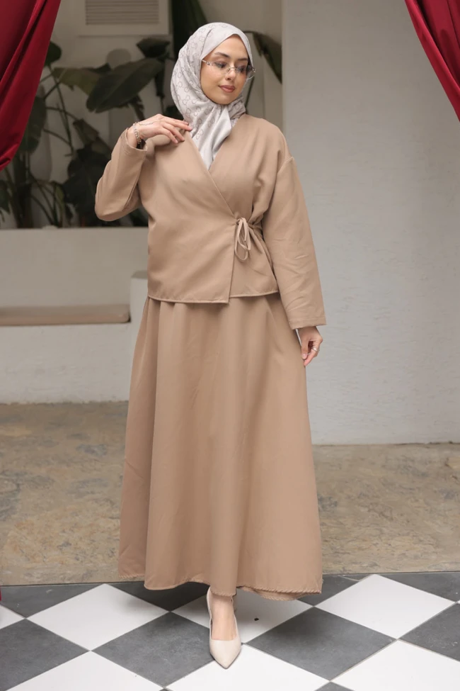 * Ürün Detay : Takım, "minimalist şıklık" ve "fonksiyonellik" kavramlarını bir araya getiren, zamansız bir tasarım. Özellikle kruvaze kesimi sayesinde klasik takımlardan ayrılan, oldukça modern bir duruş sergiliyor.Takımın en can alıcı noktası yan taraftan bağlamalı kruvaze kapama detayı. Bu kesim, hem vücut formunu daha ince ve zarif gösteriyor hem de elbiseye kimono havası katarak modern bir dokunuş sağlıyor.Belden aşağıya doğru genişleyen hafif A-kesim etek, tesettür giyimde aranan dökümlü ve hatları gizleyen yapıyı tam olarak karşılıyor.Etek bel lastiklidir.