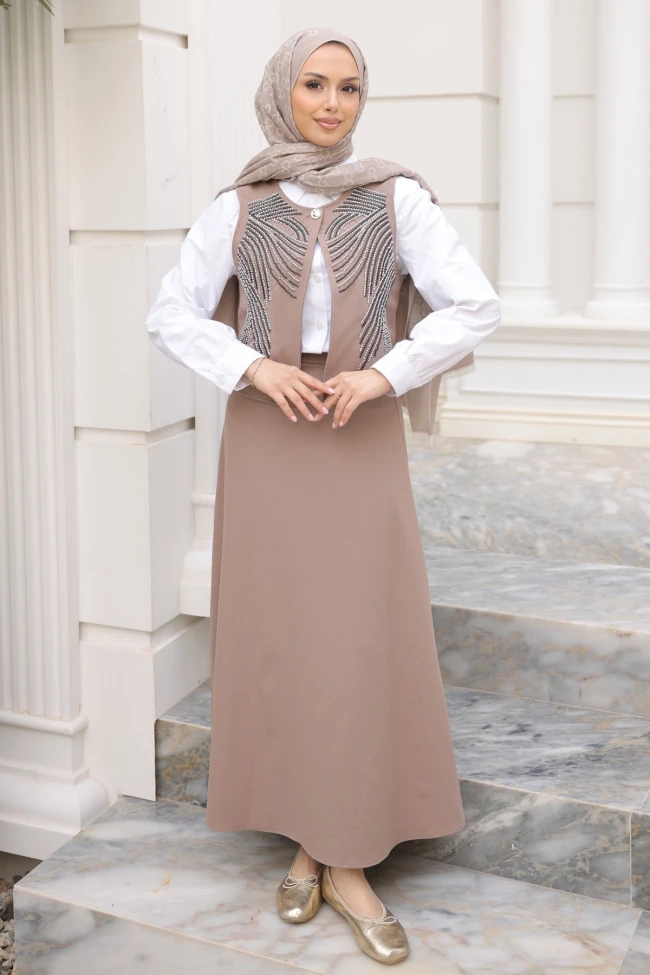 Siyah Yelek Kombinli Gömlek Etekli Takım Kahverengi Yelek Kombinli Gömlek Etekli Takım Lacivert Yelek Kombinli Gömlek Etekli Takım