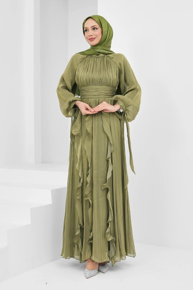 * Ürün Detay : Abiyemiz hem kullanılan kumaş dokusu hem de romantik detaylarıyla koleksiyonun en zarif parçalarından biri olmaya aday.Ürünümüz şifon kumaştan üretilmiştir.Sırt fermuarlıdır.Etek kısmından aşağıya doğru inen dikey fırfır detayları, tasarıma hem hareket hem de romantik bir hava katmış. Bu detaylar aynı zamanda silüeti daha akışkan gösteriyor.Beldeki geniş kumaş kuşağı, piliseli dokuyu toplayarak vücut hattını belirginleştiriyor ve üst beden ile etek arasında şık bir geçiş sağlıyor.Manşetlerdeki bağlama detaylı balon kollar, son dönem tesettür modasının en hit ayrıntılarından biri. Bu kollar, elbiseye hem modern hem de nostaljik bir dokunuş ekliyor.