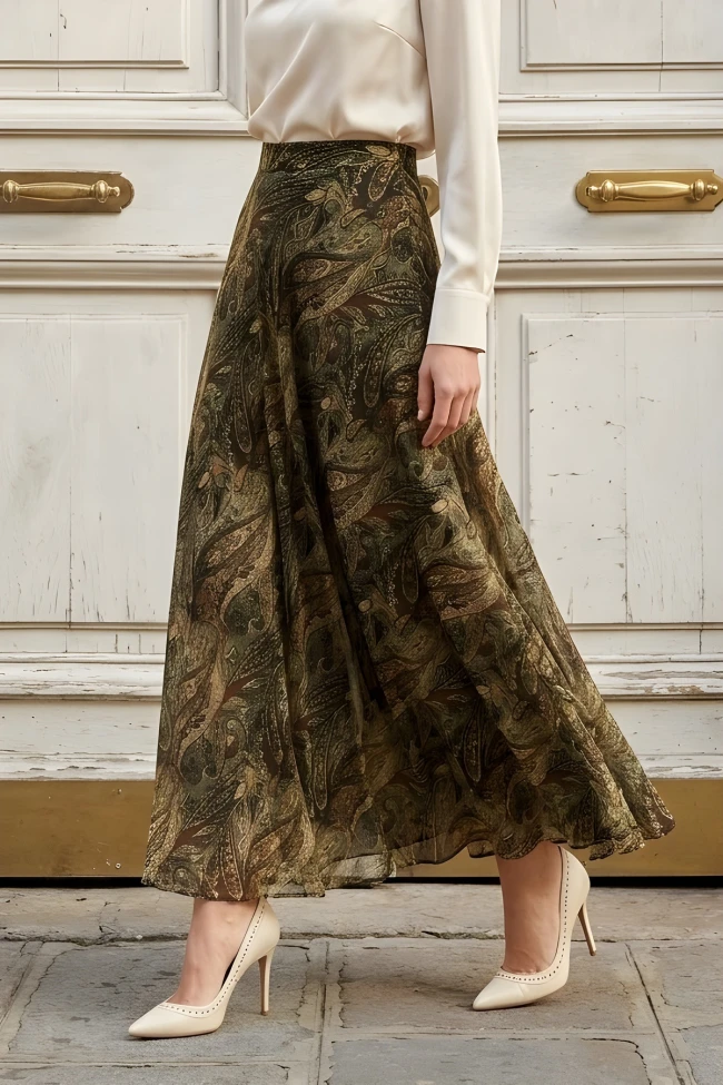 * Ürün Detay : Etek, klasik ve sofistike bir tarzı modern bir akışkanlıkla birleştiren oldukça şık bir parça.Üzerindeki şal deseni oldukça zamansız bir tercih. Karmaşık ve kıvrımlı yapısı, eteğe derinlik ve görsel bir zenginlik katmış.Etek, “sessiz lüks” akımına göz kırpan, hem ofis şıklığına hem de özel bir akşam yemeğine uyum sağlayabilecek çok yönlü ve asil bir parça.Etek belinin arka kısmı lastiklidir.Yandan fermuarlıdır.