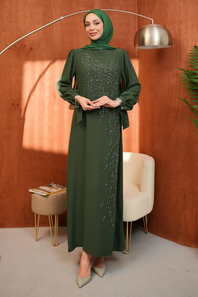 * Ürün Detay : Abiye, modest moda için oldukça zarif ve dengeli bir seçenek.Elbisenin vücuda yapışmayan, düz ve hafifçe genişleyen kesimi hem konfor sağlıyor hem de asil bir duruş sergiliyor.Büzgülü ve bağlama detaylı manşetler, düz kesime hareket katarak elbiseye romantik bir hava vermiş.Göğüs kısmından başlayıp aşağıya doğru süzülen dal dal işlemeler , tasarıma dinamizm katmış. İşlemelerin asimetrik yerleşimi boyu daha uzun gösterme etkisine sahip.