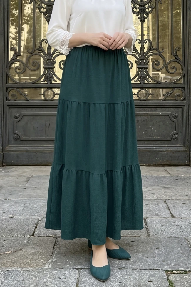 * Ürün Detay : Etek, hem konforu hem de zamansız şıklığı bir araya getiren çok yönlü bir parça. Bürümcük kumaşın kendine has dokusu, eteğe hem modern bir hava katıyor hem de kullanım kolaylığı sağlıyor.Ütü istemeyen yapısıyla kurtarıcı bir parçadır. Seyahatlerde veya yoğun günlerde kırışıklık derdi olmadan kullanılabilir.Eteğin üç katlı yapısı, modele hareket ve hacim kazandırmış. Bu kesim, silüeti daha akıcı gösterirken aynı zamanda bohem ve zarif bir duruş sergiliyor.Lastikli bel yapısı, gün boyu rahatlık sunar ve farklı beden ölçülerine kolayca uyum sağlar.