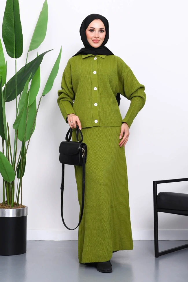 * Ürün Detay : Ürünümüz Triko kumaştan üretilmiştir. Hırka ve Etek ikili takım şeklindedir. Hırka ön kısmı düğmelidir. Etek bel kısmı lastiklidir.