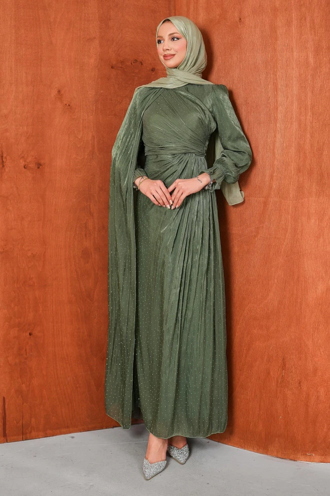 * Ürün Detay : Özel günlerinizde hem asil hem de göz alıcı bir görünüm arıyorsanız, bu tasarım tam size göre! Modern hatları geleneksel zarafetle birleştiren bu elbise, her detayıyla kusursuzluğu hedefliyor. Bel bölgesindeki çapraz drapaj detayları, vücut hatlarını olduğundan daha ince ve dengeli gösteren bir "sihirli dokunuş" sunar.Omuzdan dökülen tül pelerin detayı, yürürken asil bir akışkanlık kazandırır. Fotoğraflarda harika bir silüet oluşturmak için idealdir.