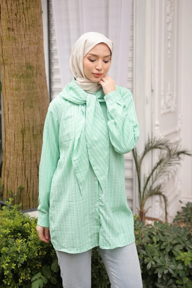 * Ürün Detay :Tunikteki en özgün kısım, boyun bölgesindeki geniş bağlama detayı. Bu özellik, parçaya klasik bir gömlek tunikten ziyade daha feminen bir hava katıyor.Pötikare desen, ürüne nostaljik ama taze bir enerji vermiştir.Rahat ve dökümlü kesimi, konforu ön planda tutan bir tasarım olduğunu gösteriyor. Uzunluğu, tesettür giyim standartlarına uygun ve kullanışlı bir seviyede.Özellikle bahar ve yaz koleksiyonları için hem ferah hem de şık bir alternatif sunuyor.
