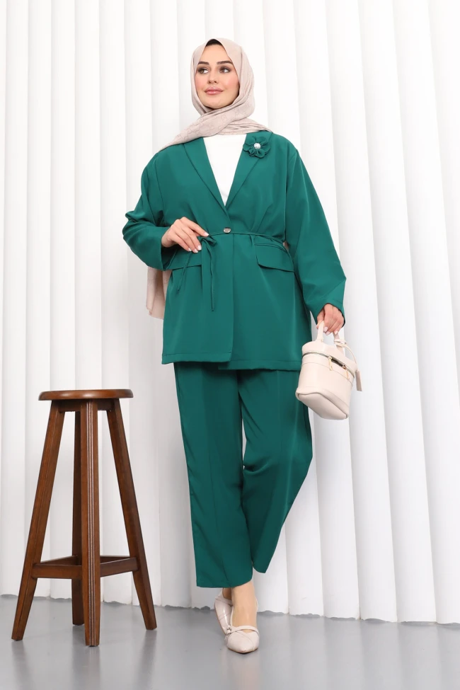 * Ürün Detay : Şık ve zarif bir takım modeli ile karşınızdayız. Ceket ve pantolon olarak 2 li takım şeklinde satıştadır. Yaka broşludur. Kravuze yakadır. Sahte cepli ve kuşaklıdır. Pantolon bel lastiklidir.