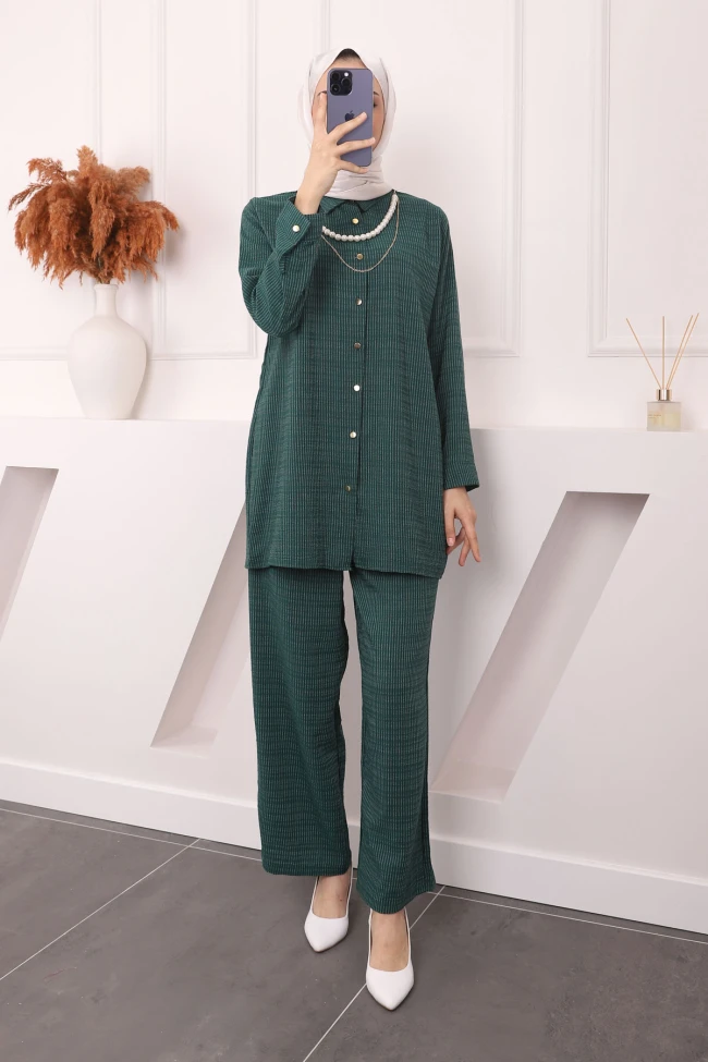 * Ürün Detay : Ürünümüz yeni sezona uygun Gofre Krep kumaştan üretilmiştir. Tunik - Pantolon takım şeklindedir. Tunik modelimiz gömlek yakadır. kolye aksesuarlıdır. Boydan düğmelidir.