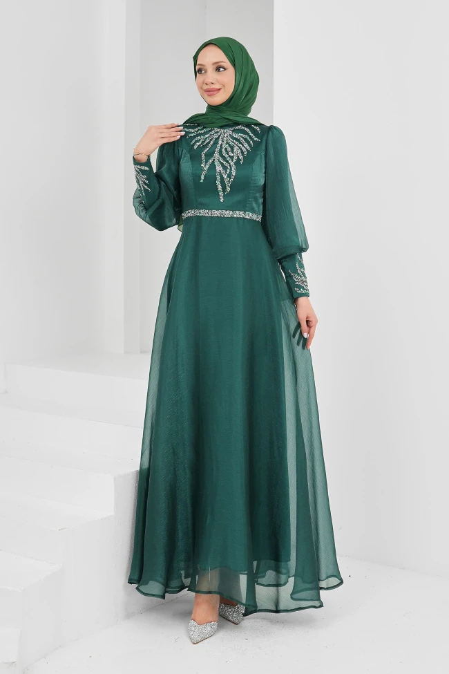 * Ürün Detay :Tesettür giyimde şıklığı ve modern dokunuşları birleştirmek isteyenler için başarılı bir seçim.Göğüs kısmındaki dal veya yaprak formundaki gümüş işlemeler, elbiseye hareket katarken dikkati üst bedene çekiyor. Bel hattındaki ince taşlı kemer detayı ise vücut oranını dengeleyerek daha zarif bir silüet oluşturmuş.Balon kol detayı ve bileklerdeki işlemeler, son yılların trendlerine çok uygun. Bu detay elbiseye hem nostaljik hem de modern bir hava katıyor.