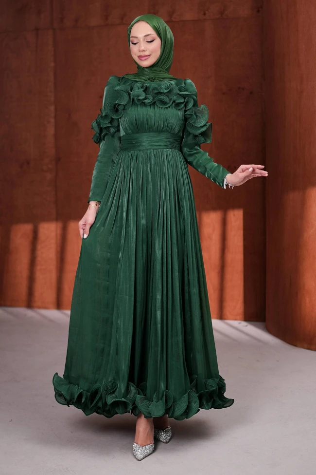 * Ürün Detay : Abiye, hem asil hem de oldukça hareketli bir tasarıma sahip.Elbisenin boydan boya piliseli olması, silüeti daha uzun ve ince gösteren harika bir işçilik. Ayrıca eteğin akışkanlığını artırarak yürürken çok şık bir hareket sağlar.Omuzlardaki ve etek ucundaki dairesel fırfır detayları elbiseye romantik ve maksimalist bir hava katmış. Özellikle omuzlardaki katmanlar, dar omuzlu kişileri daha dengeli gösterir.
